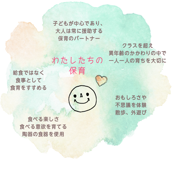 子ども達は毎日いろいろなところを触ったり、寝転んで遊んだりするため、体や衣服が汚れることが多くなります。しかしそれは子ども達の成長には欠かせない体験や様々な発見につながる大切なことなので、無理に止めさせることはできません。私たちは保育の環境を衛生的に整え、子ども達が安全で元気に遊べる環境づくりを心がけています。